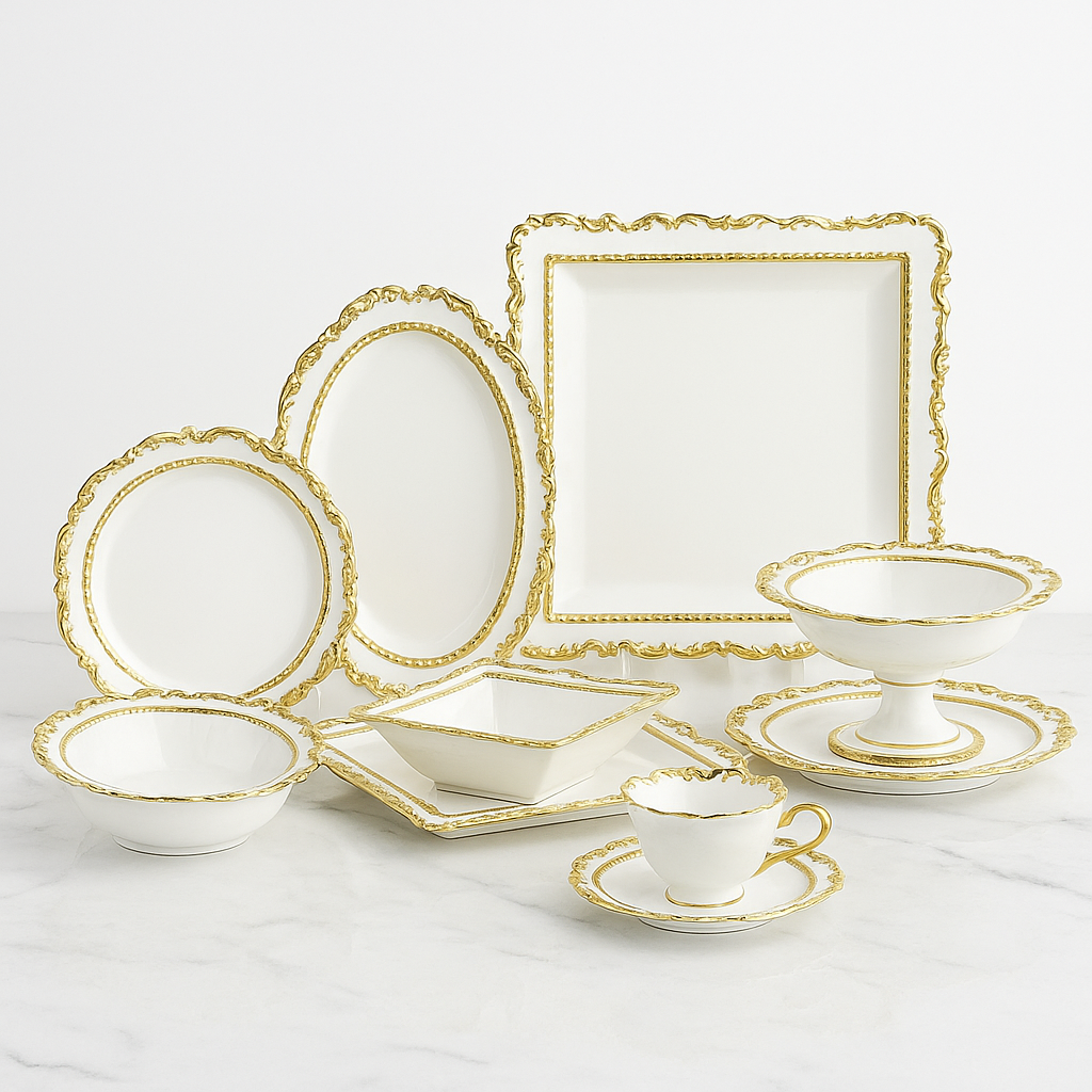 Categories: Select a Category Plate Sets Bathroom Bedding Beds Kitchenware Kitchen Appliances Decor baskets and trunks Serverware Canisters Serverware 8-Piece Baroque Porcelain Serveware Set – White with Gold Scalloped Edges CA$300.00 Purchase Added!